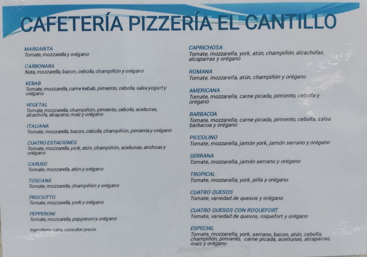 Cafetería Pizzería El Cantillo Menu